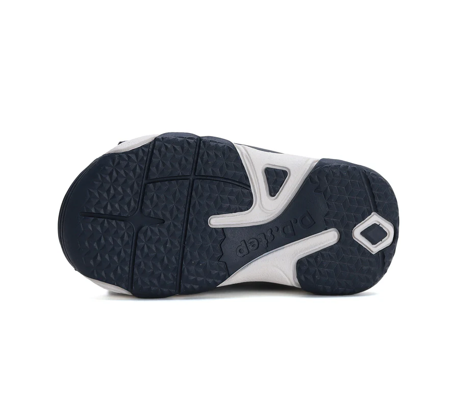 DD Step fiú bőrszandál, királykék színben, oldalán farkas mintával. A minta napfényre színesedő, ún. sun reactive. Kéreg merevített, két csattal és egy tépőzárral szabályozható.