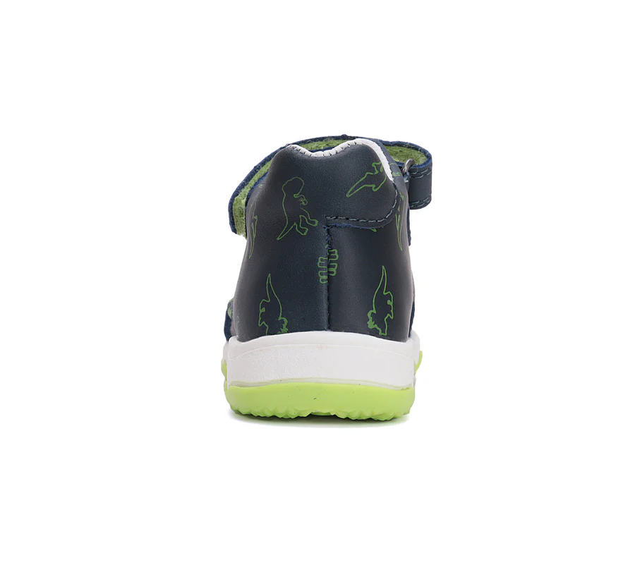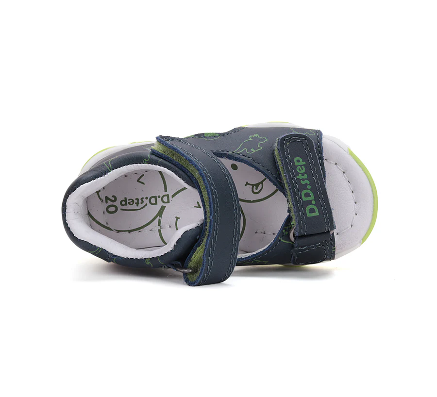 DD Step fiú bőrszandál. Királykék színben, dínó mintával. Megerősített kéreggel ellátva. A szandál két tépőzárral szabályozható.