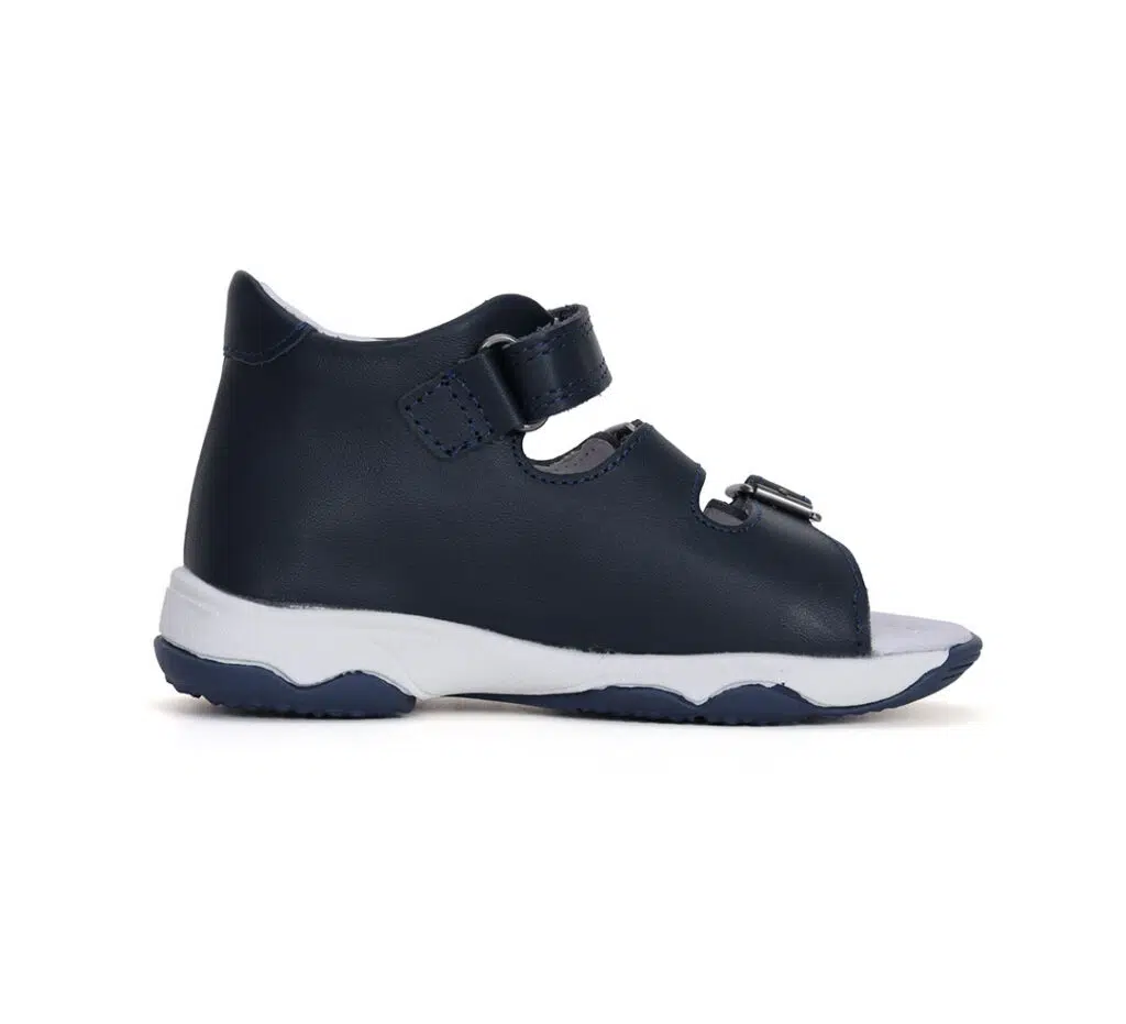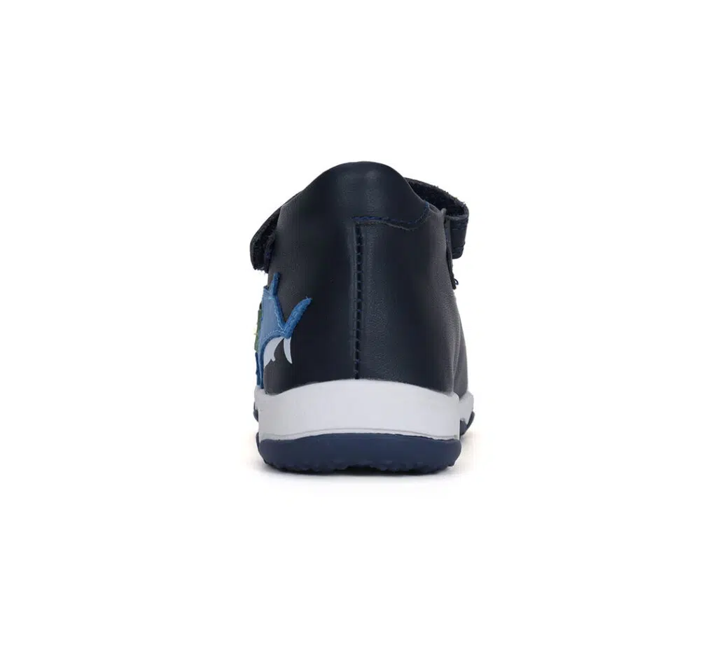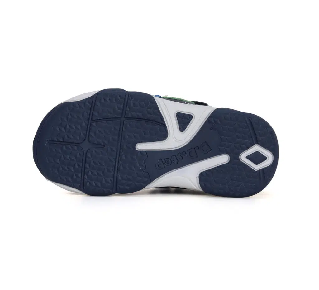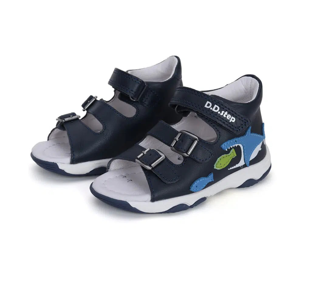 DD Step fiú szandál, oldalán cápa mintával. Megerősített kéreggel ellátva a megfelelő bokatartásért. Két csattal és egy tépőzárral szabályozható.
