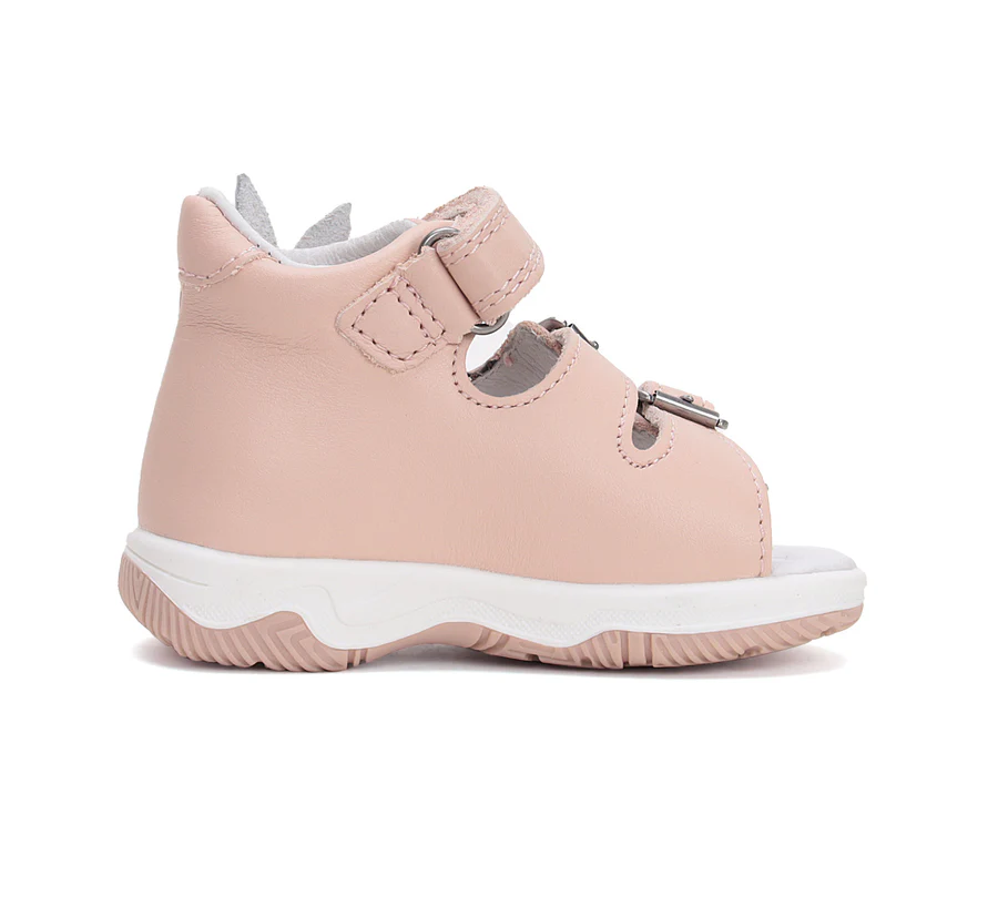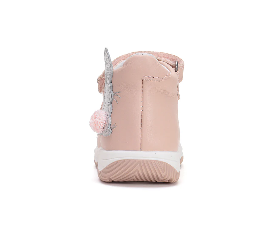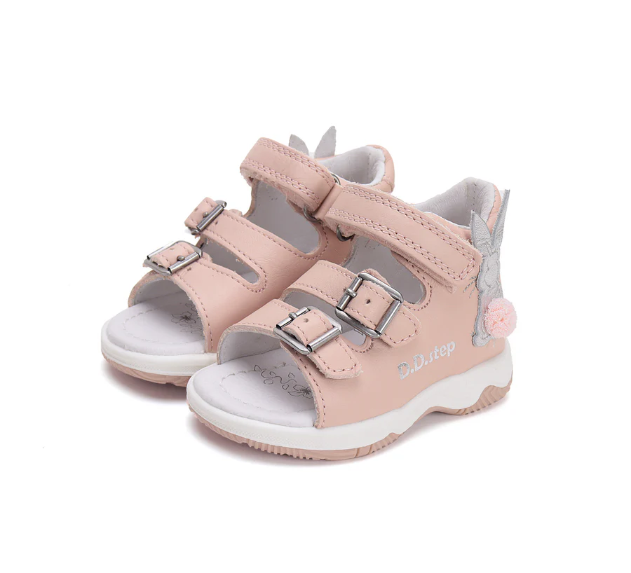 DD Step lány bőrszandál , rózsaszín színben, oldalán nyuszi mintával. Megerősített zárt kéreggel ellátva. A szabályozható tépőzáras és csattos kialakításnak köszönhetően könnyedén igazítható a gyermek lábára.