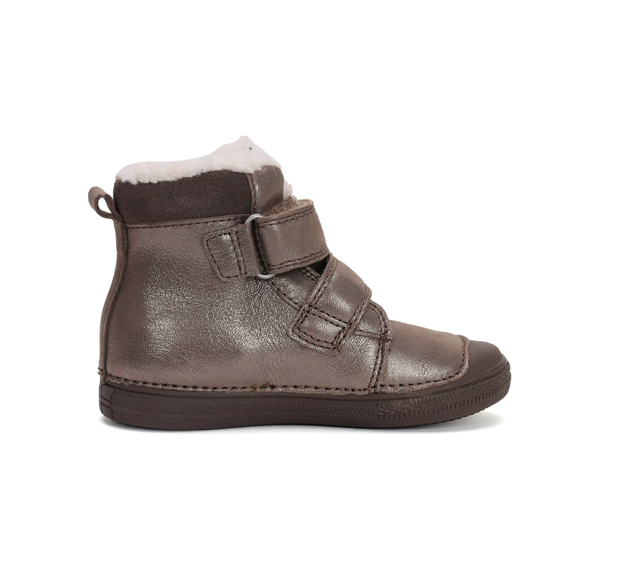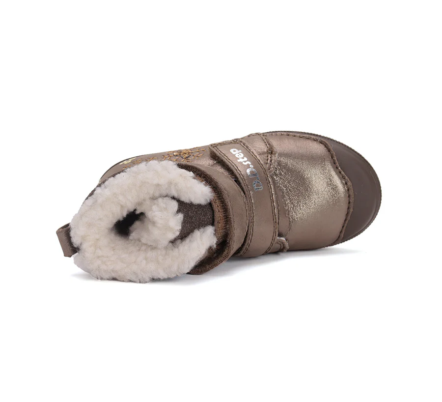 DD Step lány téli bőrcipő. Ez a valódi bőrből készült cipő nemcsak stílusos bronz színével hívja fel magára a figyelmet, hanem praktikus vízlepergető tulajdonságával is kihagyhatatlan választás a hideg hónapokra. Az oldalán található díszítés elegáns megjelenést biztosít, miközben a cipő meleg bélése garantálja, hogy a kis lábak mindig komfortosan érezzék magukat, bármilyen időjárás is uralkodjon odakint.