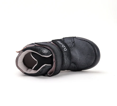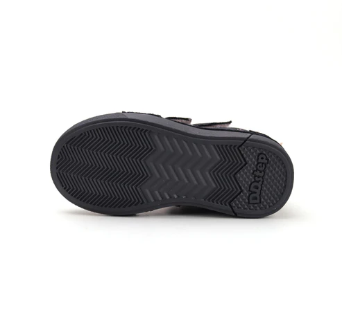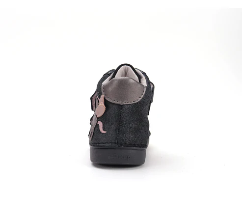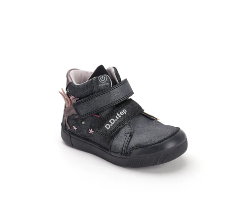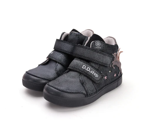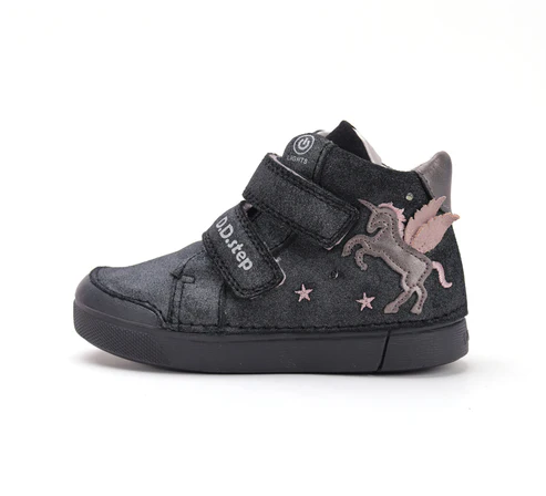 DD Step LED-es bőrcipő. Fekete -csillámos színben, oldalán unikornis mintával. Megerősített kéreggel és orrvédelemmel ellátva. Két tépőzárral szabályozható.