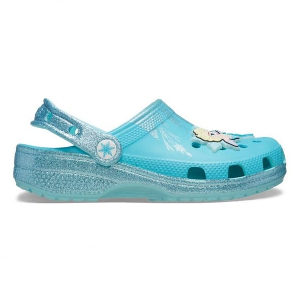 Disney Jégvarázs mese főhőse Elsa díszíti ezt a csodaszép csillogó clog papucsot. Egyedi, csillogó charmokkal díszítve. A rugalmas Croslite™ anyagnak köszönhetően felveszi a láb alakját. A papucs illeszkedését forgópántok támogatják a sarkaknál. Talpmasszírozó bütykökkel segítik a vérkeringést, magasított sarkai pedig jobb támasztást biztosítanak. Az Iconic Crocs Comfort™ technológiával és harántemelő boltívvel lettek ellátva.