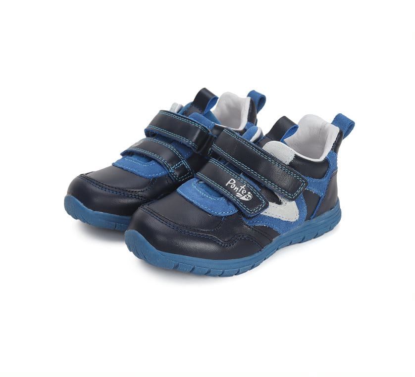 Ponte20 szupinált fiú bőrcipő. Fekete és királykék színben. Megerősített kéreggel ellátva a megfelelő bokatartásért. két tépőzárral szabályozható.
