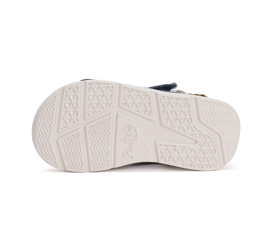 Ponte20 szupinált fiú bőrszandál, királykék színben, oldalán cápa mintával. Megerősített kéreggel ellátva. A szabályozható tépőzáras kialakításnak köszönhetően könnyedén igazítható a gyermek lábára.