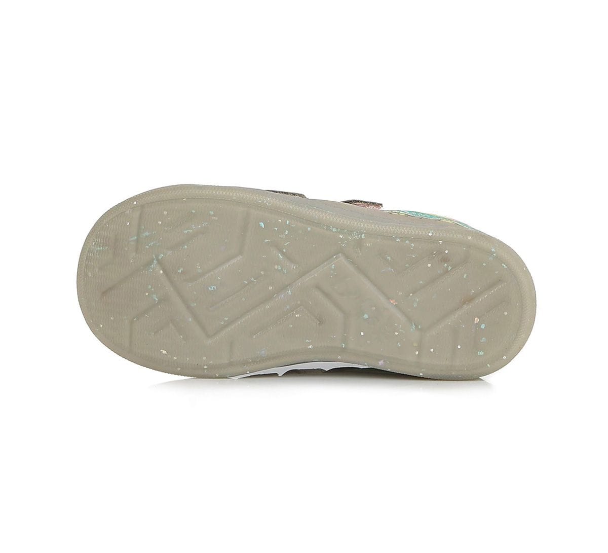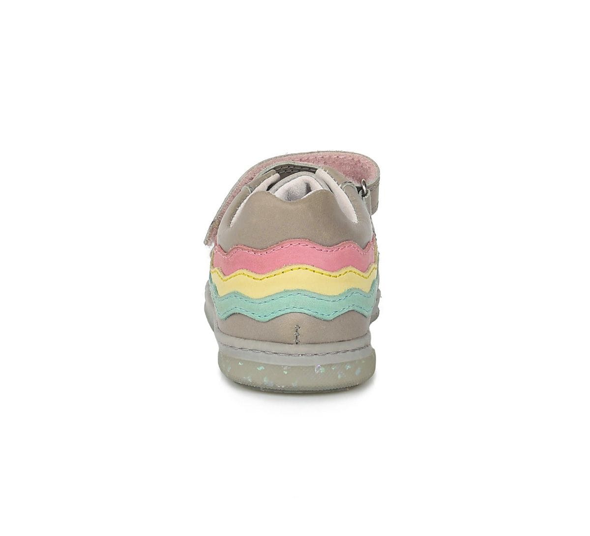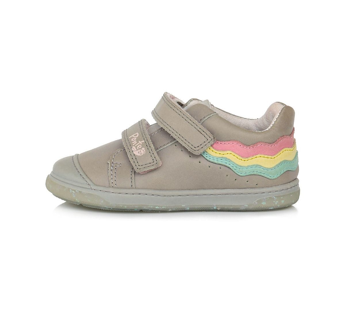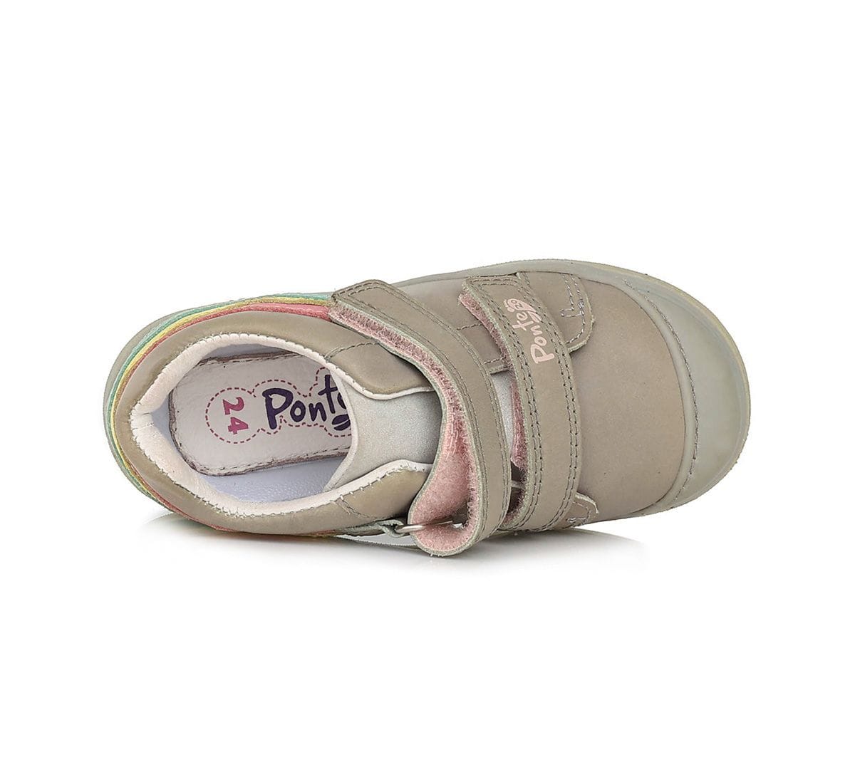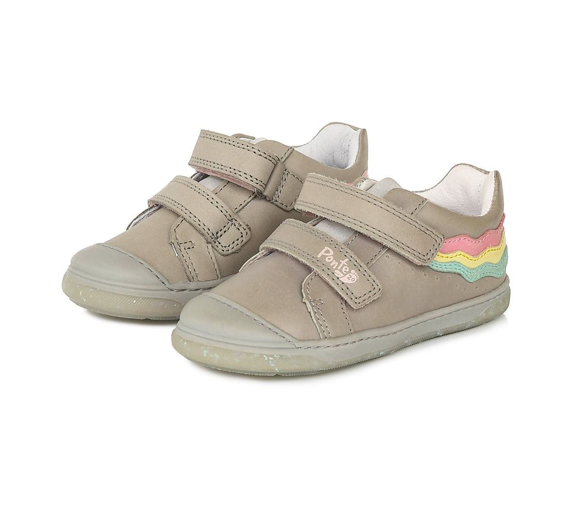A Ponte20 szupinált lány bőrcipő szürke színben, vidám színes hullámmintával modern és kényelmes választás a mindennapokra. A szupinált sarokkialakítás segíti a boka megfelelő tartását, támogatva a helyes lábállást.
