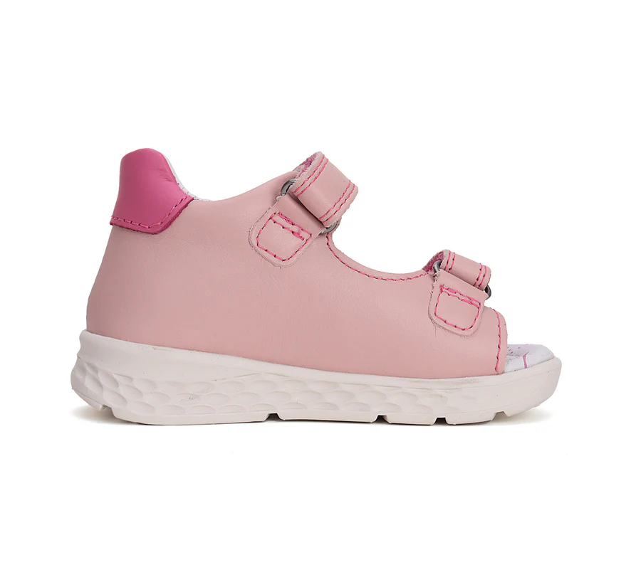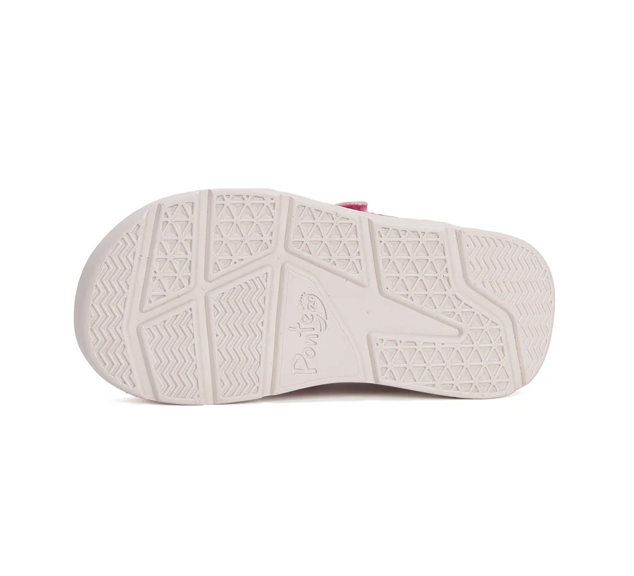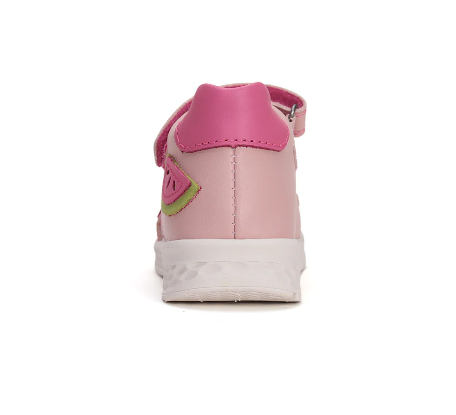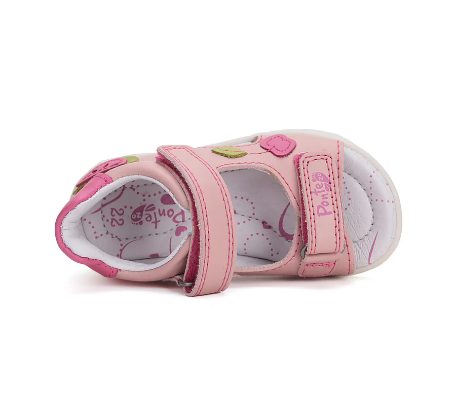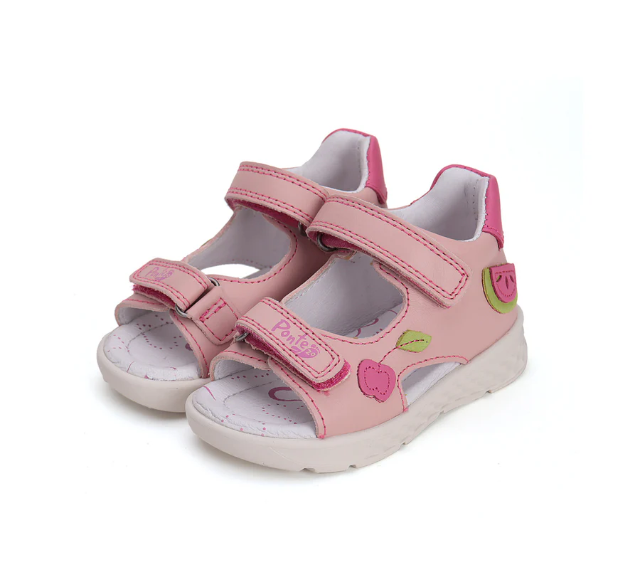 Ponte20 szupinált lány bőrszandál. Rózsaszín színben, gyümölcs díszítéssel. Két tépőzárral szabályozható. Hajlékony, könnyű talppal készült.