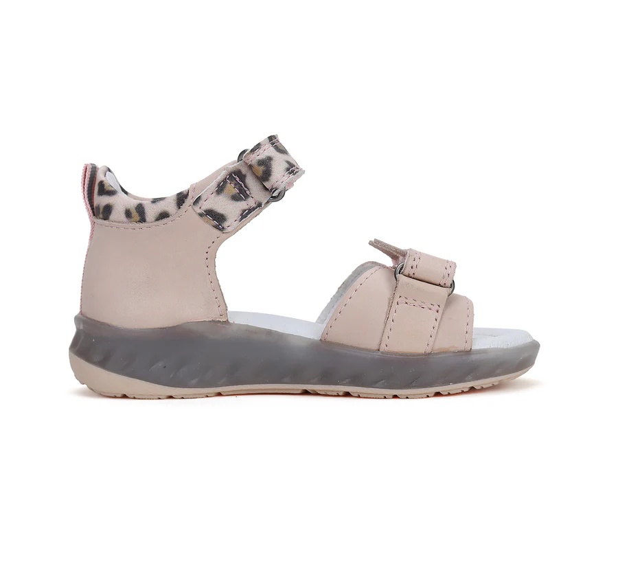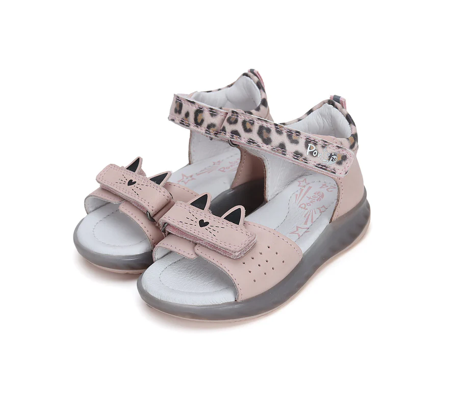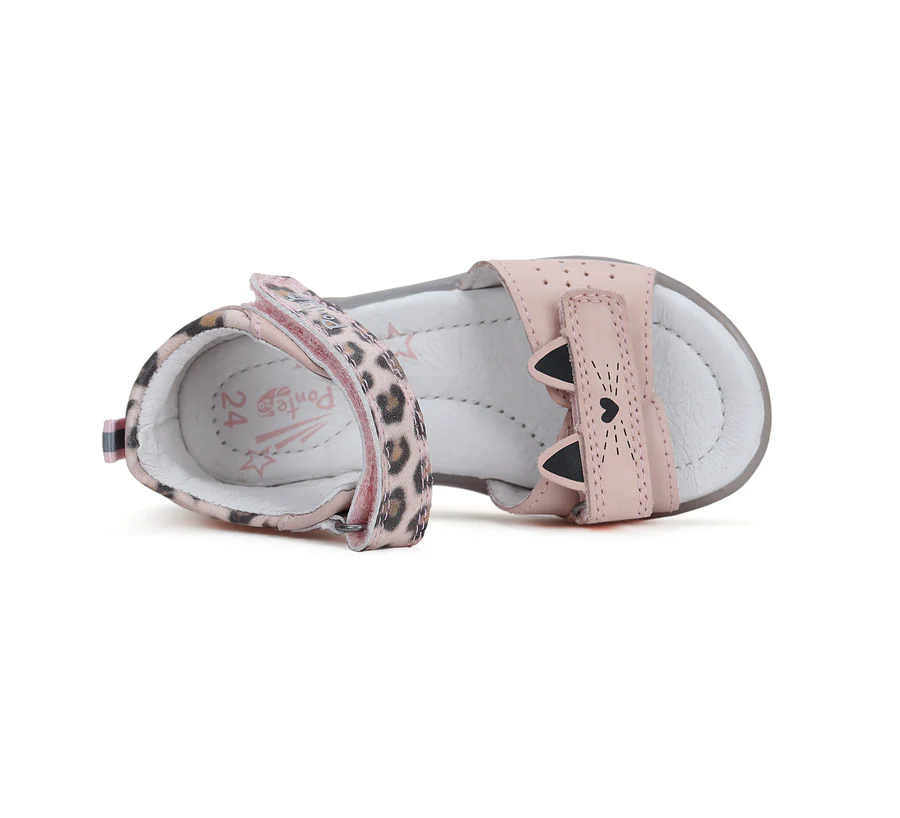 Ponte20 szupinált lány bőrszandál. Rózsaszín színben, cica mintával. Megerősített kéreggel ellátva, két tépőzárral szabályozható.