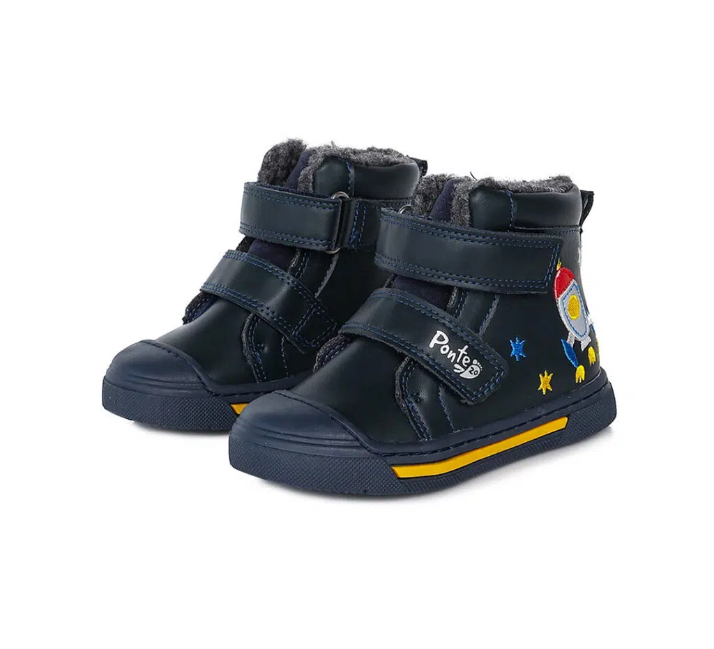 Ponte20 szupinált téli fiú bakancs, fekete színben. Oldalán rakéta mintával. Kívül bőr, belül bunda béléssel. Megerősített kéreggel és orrvédelemmel ellátva.
